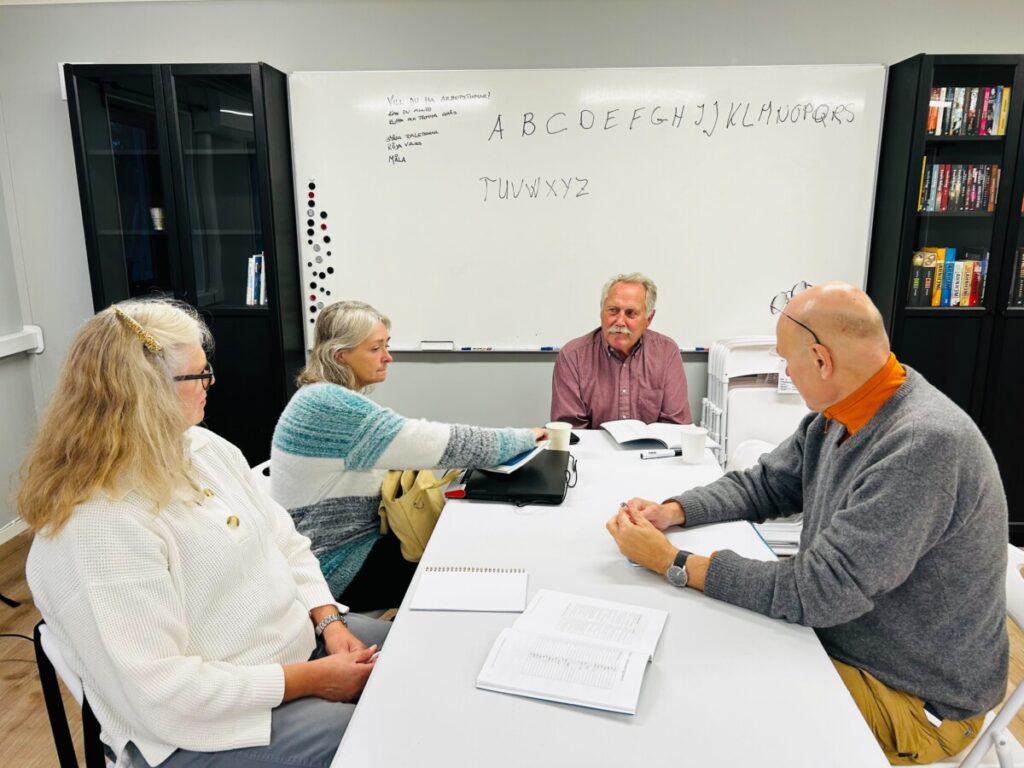 I klubbstugan har kvällens lektion precis börjat och först på schemat är en genomgång av bokstaveringstabellen.